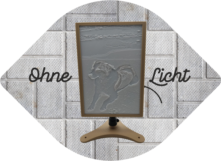 Jedes Leuchtbild wird mit Deinem persönlichen Motiv gefertigt – ob ein geliebtes Porträt, ein magischer Moment oder ein fantasievolles Design. Die feinen Reliefstrukturen erzeugen beim Beleuchten ein lebendiges Bild, das im Dunkeln seine volle Magie entfaltet.